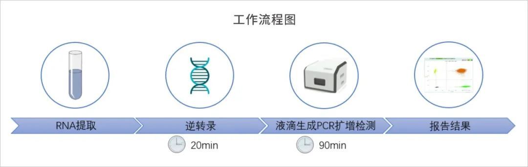该方法操作简便,实验总时长预估在3小时内:第一步从全血中提取RNA,第二步逆转录成cDNA,第三步配制dPCR反应体系,载入DropXpert S6仪器上自动生成液滴,扩增与检测信号,第四步直接出具结果数据。